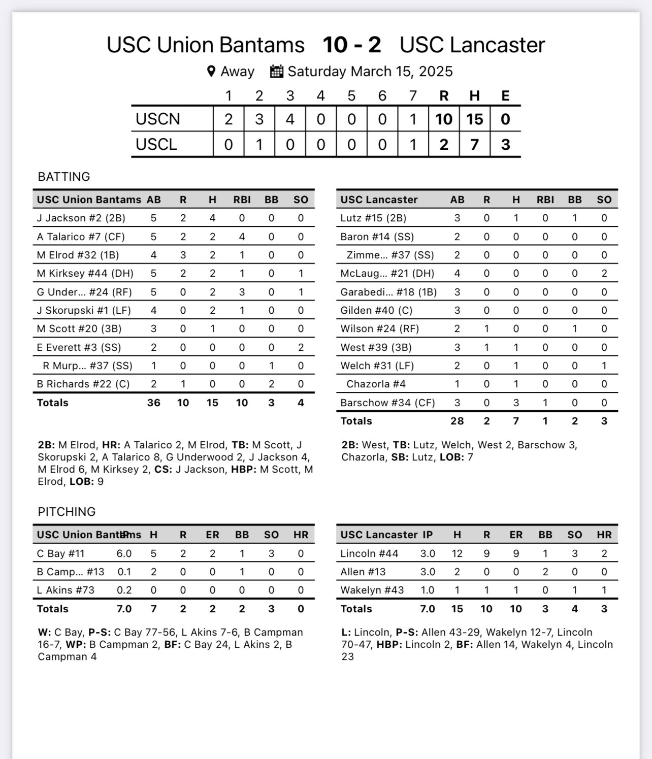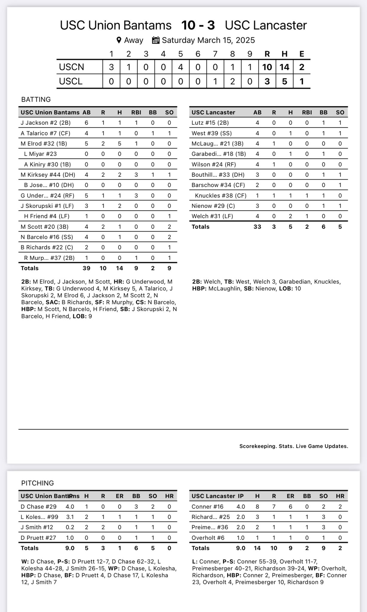 USC Union 10, USC Lancaster 3, Game 2 - Uni: Mason Elrod 5-5, 2B, 2 R, RBI